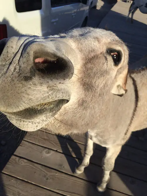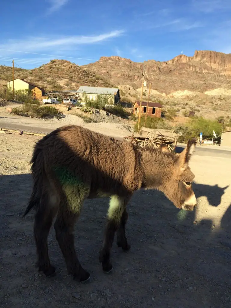 Am späten Nachmittag war hier nicht mehr viel los und meine geliebten „Burros“ freuten sich auf die frischen Möhren die ich ihnen mitgebracht habe. Die Kleinsten bekamen nichts, denn sie hatten STOP Aufkleber auf dem Kopf, auf denen stand, dass man sie nicht füttern durfte. Diese Esel sind ganz schön aufdringlich, einer bekam von mir sofort den Namen „Penetranto“ verpasst. Penetranto leckte, als die Möhren alle waren, mein Auto ab und ehe ich mich versah, biss er einfach ungeniert in den Außenspiegel. Böser Penetranto! Ansonsten sah Oatman aus wie immer, und wie immer fand ich das Dörfchen toll. Was vielleicht noch erwähnenswert ist, dass die Stadt Oatman nach Olive Oatman benannt wurde, ein kleines Mädchen welches von Apachen entführt und später wieder befreit wurde. Da ging es ganz schön zu im Wilden Westen. Übrigens wird hier in den Minen rund um Oatman wieder Gold gefördert, ich versuchte aber nicht mein Glück. Da mir vor 2 Jahren die Gravel-Road Silver Creek Road so gut gefallen hatte, beschloss ich statt der Hauptstraße nach Laughlin, noch ein wenig abseits der Straße zu brettern.