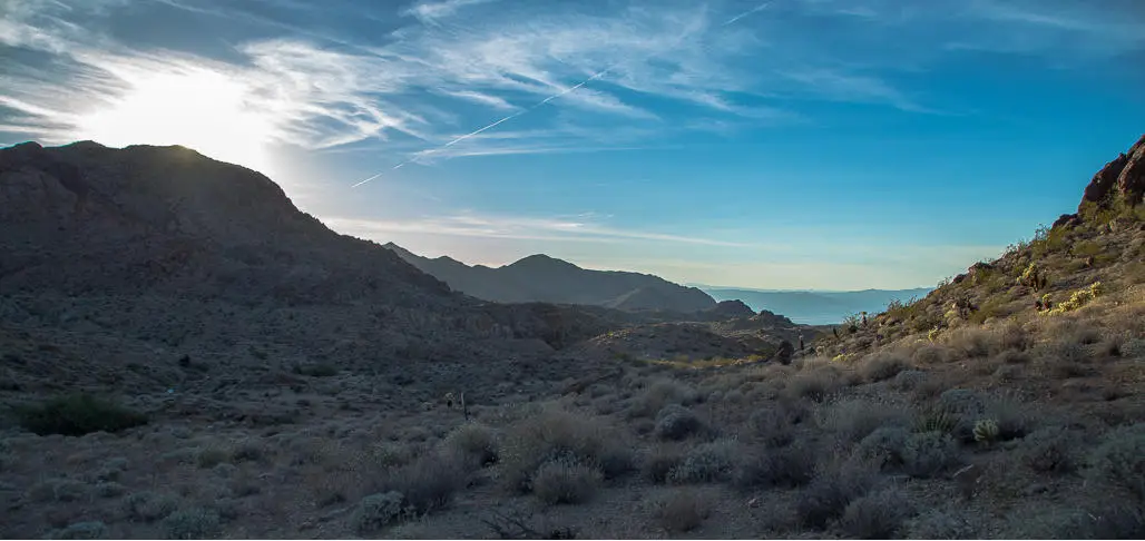 Die Sonne ging gerade unter und warf ein wunderschönes Licht auf die Landschaft. Überall gab es prächtige Kakteen an den Hängen, die mich nicht nur einmal Anhalten und Aussteigen ließen. Sogar einen Saguaro habe ich entdeckt, der wurde aber bestimmt aus Südarizona importiert, da er in der Nähe eines Hauses stand. Das hätte ich nun wirklich nicht gedacht, dass ich in diesem Urlaub auch noch einen Saguaro sehe. Durch die tiefstehende Sonne wirkte die Strecke noch viel schöner als das letzte Mal, ich hatte auch den Eindruck, dass einfach viel mehr Pflanzen blühten als im Mai. Nach einer guten halben Stunde erreichte ich Laughlin, füllte dort den Tank auf und fuhr über die Staatsgrenze nach Nevada. Nun war es nur noch eine Stunde nach Las Vegas.