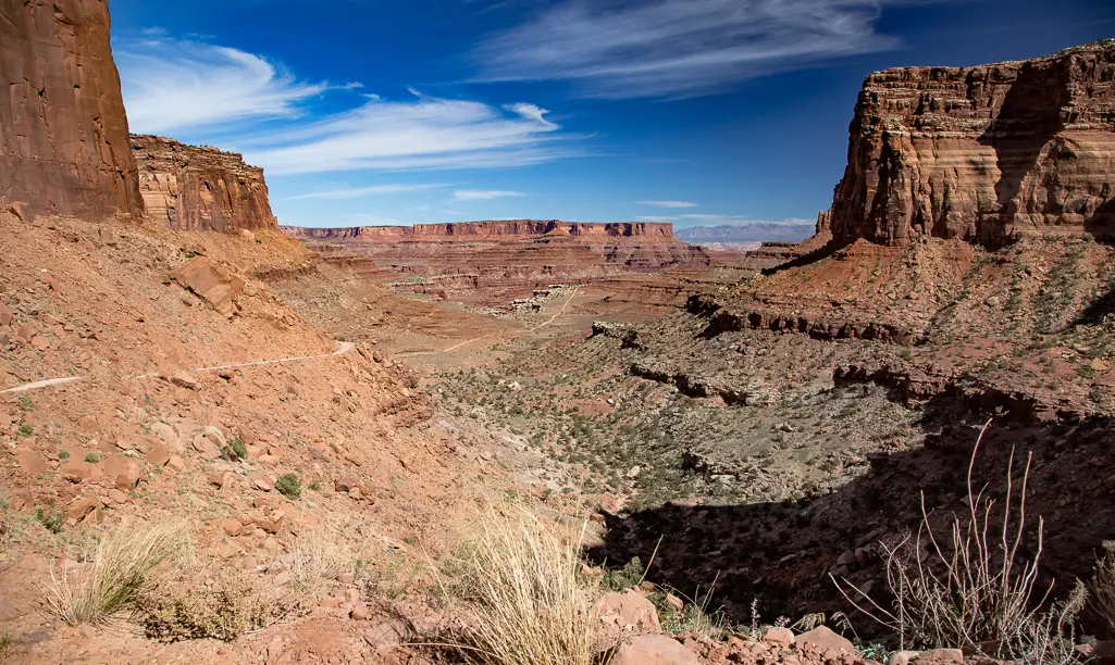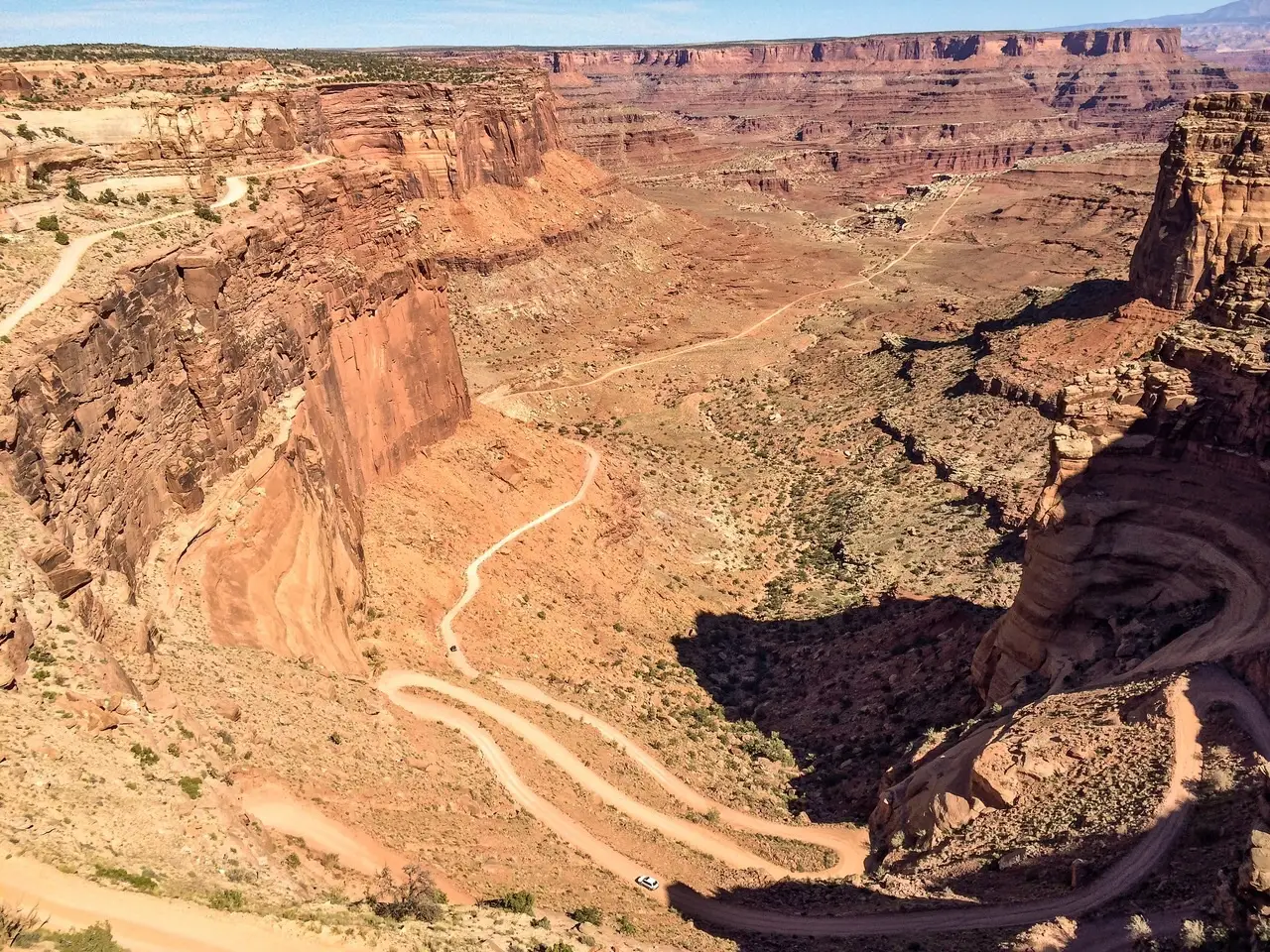 Ich guckte auf die Uhr, eine Stunde hatte ich vom Hotel bis zum Arch gebraucht. Es war schon mal klar, dass um 6 Uhr am nächsten Tag Abfahrt zum Mesa Arch ist. Ehrfürchtig blickte ich weiterhin in die Tiefe, und ja, ich wollte da jetzt unbedingt runter fahren. Am Shafer Trail Viewpoint begutachtete ich noch gespannt die Strecke, die ich in wenigen Minuten nach unten fahren werde. Die Autos die darauf unterwegs waren sahen von oben winzig klein aus. Jetzt mal ran an den Speck. Ich bog rechts ab und nun gab es kein Zurück mehr. Ein bisschen aufgeregt war ich ja schon, aber als ich gemütlich Serpentine für Serpentine nach unten rollte, legte sich das schnell wieder.