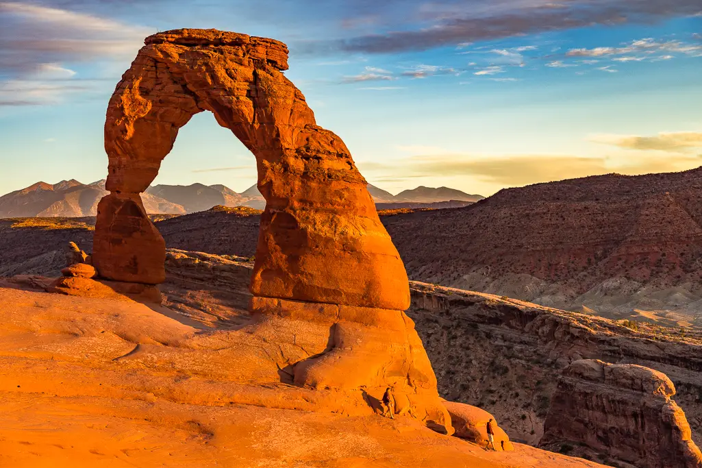Die ersten Meter kannte ich ja schon, die Slickrockplatte war schnell erreicht. Mit ein paar Pausen war die Steigung aber definitiv zu meistern. Oben ging es dann moderat ohne größere Anstiege weiter. Als ich die letzten paar Meter um die Kurve ging stand mir der berühmte Delicate Arch gegenüber. Wahnsinn! So ein großes Teil hätte ich nicht erwartet, obwohl ich zu Hause auch Fotos mit Menschen drauf gesehen hatte. Einfach wow! Doppel-Wow! Die Idee den Sonnenuntergang am zwanzig Meter hohen Delicate Arch zu erleben hatten mit mir ungefähr noch 200 andere Menschen. Da oben war fast schon Stadion-Feeling. Als die Sonne sich Richtung Horizont bewegte, wurde jeder, der auch nur den Versuch machte sich noch unter, oder neben den Arch zu stellen, von 200 Menschen ausgebuht.