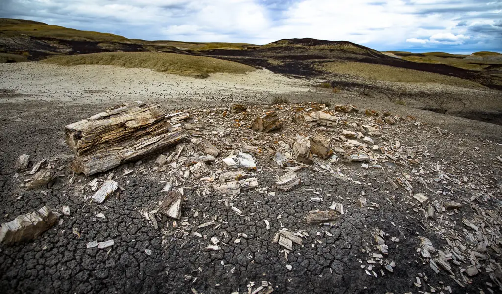 Die Temperaturen von 20 Grad waren genau richtig für diese Wanderung. An jeder Ecke findet man neue beeindruckende Dinge. Riesige Brocken von versteinertem Holz, daneben versteinerte Holzsplitter. Sogar Holzhoodos sind vorhanden. Ich fand zudem diverse Fossilien, u. a. versteinerte Haut von einer Urzeit-Schildkröte. Komplett beeindruckt von diesem archäologischen Spielplatz, vergaß ich ganz, dass ich ja zum Flügelkönig wollte. Immer wieder blieb ich stehen und inspizierte die frei gespülten Schätze. Irgendwann erblickte ich allerdings das Ziel auf einer kleinen Anhöhe und hatte schon Angst, dass der King of Wings abgebrochen ist. Allerdings sah es nur von der anderen Seite so aus. Ich kletterte in der weiteren Umgebung herum und konnte mich gar nicht satt sehen. Als ich eine kleine Anhöhe runter gehen wollte, rutschte ich aus und fiel ein paar Meter ins Tal. Die messerscharfen kleinen Steine bohrten sich dabei schön in meine Handfläche.