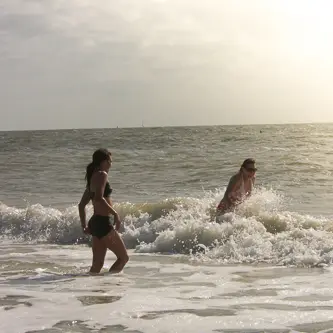 Carina ist ein Strandmensch und hatte sich schon den ganzen Urlaub gefreut im Meer baden zu gehen. Kurzerhand war sie auch schon drin. Da sie sich seit Tagen weigerte den Hauspool zu betreten, in dem ich ja schon längst gebadet hatte, überwand ich mich auch in die Fluten zu stürzen. Ich kam bis zum Bauchnabel und verließ das Wasser wieder. Kaaaalt und windig, nein das ist nichts für mich. Kurz dachte ich an meinen diesjährigen Koh Samui Urlaub und den 28 Grad warmen Golf von Thailand. Ich legte mich wieder auf mein Handtuch und guckte Elke und Carina zu, die wirklich ihren Spaß mit den meterhohen Wellen hatten. Toll, jetzt war ich nass. Der Wind wehte den feinen Sand überall hin und nach 5 Minuten war ich von oben bis unten paniert.
