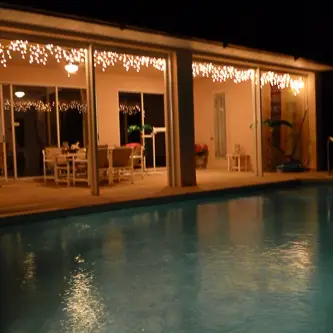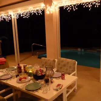 Soviel zu den ganzen klischeehaften Fernsehserien, bei denen Jennifer Aniston schon morgens um sieben den Truthahn stopft. Wir stellten fest, dass der Pool für die aktuelle Außentemperatur von ca 26° C ziemlich kalt war. Es stand doch etwas von einer Poolheizung in der Beschreibung. „Die Suche nach der Poolheizung hatte begonnen“ Wie auf einer Schnitzeljagt liefen wir alle wie aufgescheuchte Hühner durch die Anlage, mit der Aussicht, endlich in einem warmen Pool zu plantschen. Gesucht, gefunden, kaputt. „Service…, was heißt hier Service!“ Das Lämpchen auf dem riesen Generator blinkten rot. Auch wahlloses Drücken brachte den Rotor nicht in Gang. „Mist…!“ Dennoch ließen wir uns den Spaß nicht nehmen, und ein paar von uns, inklusive mir sprangen wagemutig in das eiskalte Wasser. Abends deckten alle den Tisch auf der Terrasse ein und beleuchteten den Poolbereich mit dem vorhandenen Material hell, so sehr, dass wir an einem Kontest für die beste Kitschbeleuchtung teilnehmen hätten können. Der vorhandene Gasgrill war schnell angeschmissen und heiß. Schon brutzelten die ersten Burger und Würstchen darauf. Genüsslich aßen wir zu abend und fielen nach dem Aufräumen auch direkt ins Bett. Ich glaube es war halb 10.