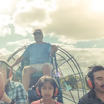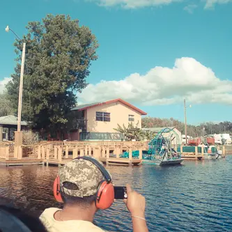 Von außen sieht die „Station“ aus wie eine heruntergekommene Tankstelle, bei der Crocodile Dundee als Kassierer arbeitet. Die Tankstelle ist aber ein Anglershop und der Kassierer sieht auch nicht aus wie Paul Hogan, sondern ist ca. 200 kg schwer und ähnelt eher einem Weihnachtsmann im Hillbillie Outfit. Wenn man versucht ihn zu verstehen muss man sehr gut Englisch können. Die einstündige Fahrt kostet $ 35. Wir hatten vorher aber aus einem Touristenmagazin für Florida einen Coupon ausgeschnitten und konnten so $ 5 sparen. Es kam gerade eine Truppe mit dem Boot zurück und wir konnten nach dem Bezahlen sofort zum Bootsanleger gehen. Vorbei an Käfigen mit Schlangen, Echsen, Spinnen und sonstigem interessanten Getier. Der Fahrer sah auf jeden Fall vertrauenswürdiger aus als der Hillbillie Weihnachtsmann.