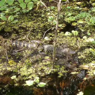 Der Loop dauert, wenn man ihn gemütlich geht, ca. zwei Stunden. Wir beschlossen deshalb die Abkürzung zu nehmen um ohne Zeitdruck die Natur zu erleben. Es waren nicht sehr viele Besucher da, so konnte man die Stille der Sümpfe in vollen Zügen genießen. Die Mitarbeiter, die hier zum Großteil freiwillig arbeiten, waren alle sehr freundlich und erklärten uns schon am Eingang, wo man am Meisten sehen kann. Zum Beispiel waren am Nordteil des Parks Babyaligatoren mit der Mutter im See. Der Pfad aus Holz ist sehr gut in Stand und am Rand sind immer wieder Tafeln mit Beschreibungen der verschiedenen Bäume und Tierarten.Am Nordteil angekommen hielten wir Ausschau nach den Aligatoren. In der Tat sahen wir sofort einen kleinen Babyaligator. Die Ranger hatten Fernrohre aufgestellt, die man kostenlos benutzen durfte.