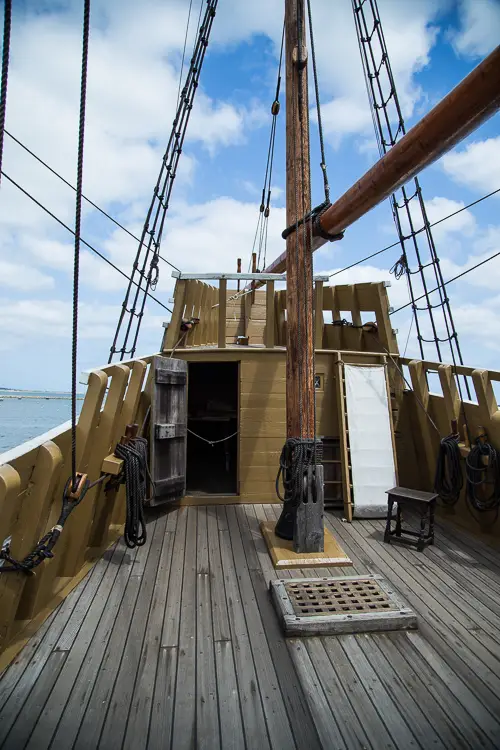 Am späten Vormittag erreichte ich Plymouth, wo ich die Mayflower II besuchen wollte. Wie in Mystic auch schon, gab es dort leider noch mehr Schulklassen. Schade, ich dachte, da keine Saison ist, kann ich das Schiff in Ruhe erkunden. Wer nicht weiß, was die Mayflower ist, dem soll gesagt sein: Es ist DAS Schiff, nämlich DAS eine Schiff, das die Pilgerväter 1652 von England nach Amerika brachte. Ein paar starben an Bord, und den Rest raffte der schwere Winter dahin.