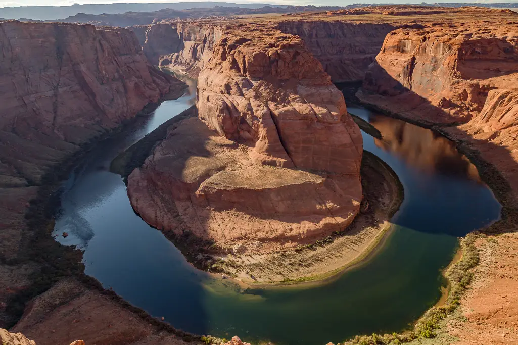 Der weitere Weg nach Page war sehr eintönig. Ich überlegte ob ich noch den Antelope Canyon besuchen sollte, verschob dies aber auf nächsten Tag. Dafür schaute ich noch beim Horseshoe Bend vorbei .Der Parkplatz war halbleer, eine gute Ausgangssituation. Ich musste ein bisschen über das Bild am Hinweisschild schmunzeln, warum kann sich jeder denken. Obwohl ich schon mal in Page war, habe ich dennoch noch nie den Horseshoe Bend besucht. Ich ging den Hügel nach oben, dort ist ein Pavillon mit Sitzmöglichkeiten aufgebaut. Ich war an dieser Stelle recht überrascht, dass der Horseshoe Bend doch so weit entfernt ist, ich dachte eher bei der Vielzahl der Besucher ist es eher ein Katzensprung. So stampfte ich den sandigen Weg nach unten. Steile ungesicherte Abhänge sind nichts für mich, daher konnte ich wohl diese Stelle hier nicht so sehr genießen. Aber diese Schleife die der Colorado in das Gestein gefräst hat sieht sehr imposant aus.