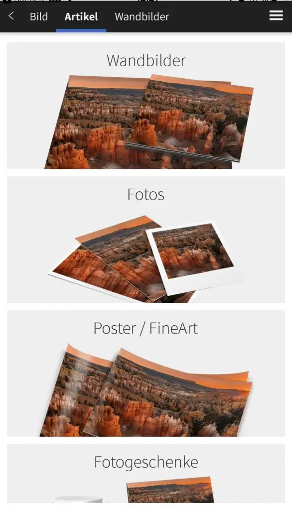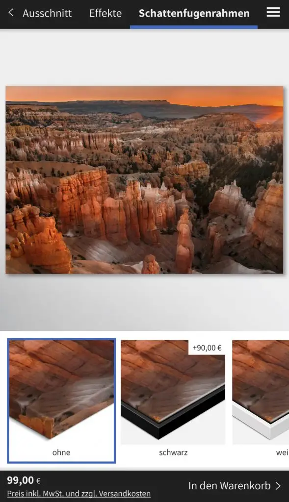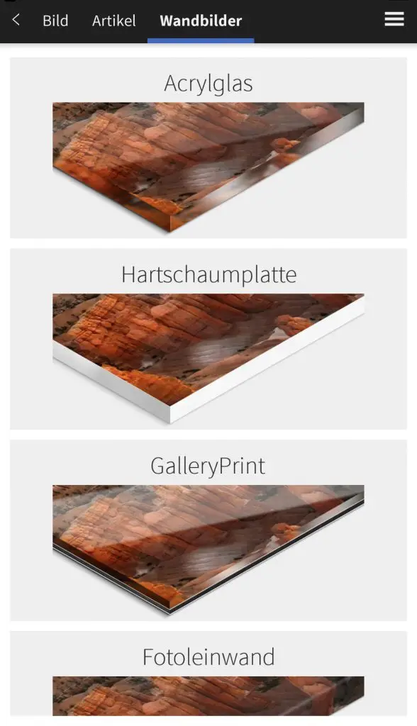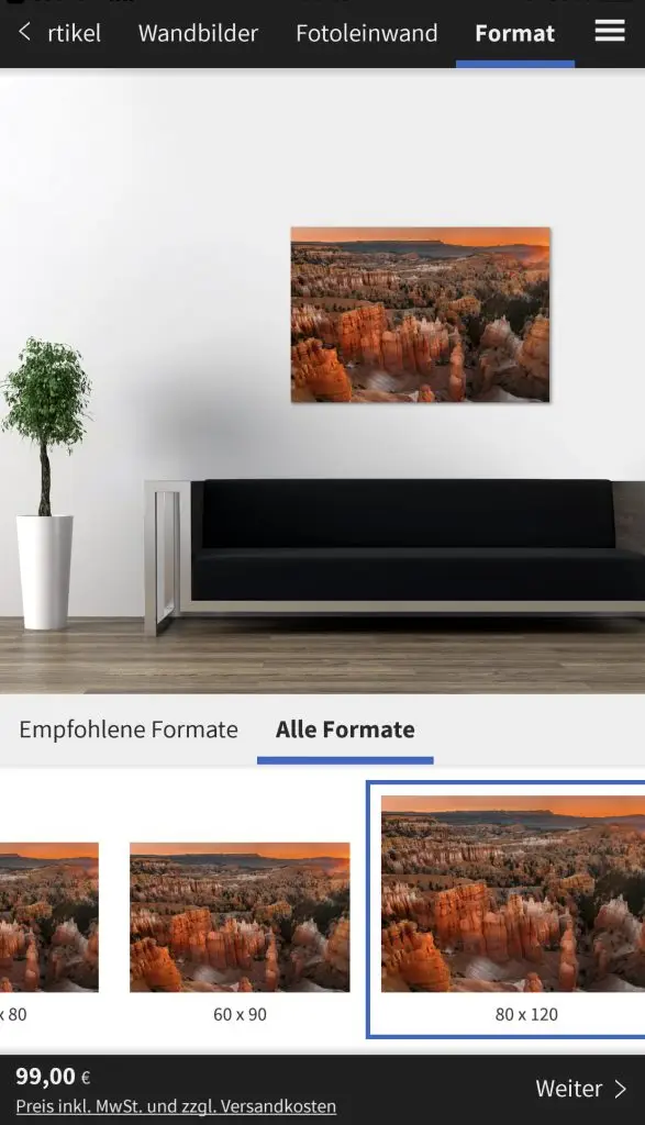 Die Saal Digital App ist kostenlos über den Appstore und für Android über den Playstore erhältlich. Die Navigation ist selbst erklärend. Als erstes wählt man das Bild aus seinen Fotos, welches man als Wandbild gestalten möchte. Als nächstes kann man sich entscheiden, welche Art von Wandbild man bestellen möchte. Die Entscheidung fiel auf die Fotoleinwand. Nun kann man das Format auswählen. Es werden einem sofort die Maße, Preis und eine kleine Vorschau über einem Sofa angezeigt.